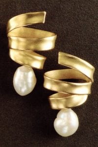 These earrings are but one version of several Peel variations. Originally inspired by a twist of lemon in a martini, Akagi carved the original model in wax. Once the mold was made, Akagi could add set stones or drop pearls to the commercial castings. She is very interested in creating a soft look, which Akagi sees as a metaphor for the feminine. Consequently, there are no hard edges in her jewelry.