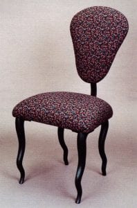 The Calamari Chair is another example of an object made with both hand and computer-aided technologies. Handler first develops the forms of the legs, seat, and back support in Form-Z®, a solid modeling program. Switching to drafting mode, Handler prints out measured drawings, which he takes to his modelmaker. The modelmaker then makes life-size patterns in wood or resin. Because the initial drawing is done in the 2-D space of the computer screen, Handler must make some adjustments at this stage to account for the three dimensionality of the patterns. The aluminum parts are then sand-cast at a local foundry. Handler drills, grinds, and welds the cast parts in his own studio before having the metal powder-coated and the seat upholstered.