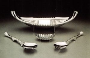 In producing objects for TROY Diepenbrock utilizes an exceptionally broad range of subcontracted industrial manufacturing processes. For example, his fanciful picture frames are made from resin cast by one company them, after the raw plastic castings are cleaned up in Diepenbrock's studio they are electroformed in silver by another industrial company. His aluminum centerpiece candle holder and Saladmanders salad servers are foundry sand cast by still another company which also polishes them. Having this work done out of house reduces the investment in equipment while maximizing Diepenbrock's design range and freedom.
