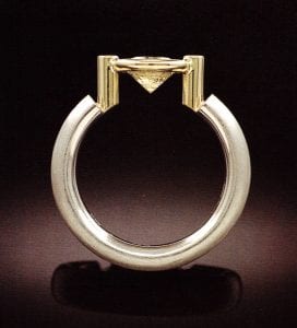 The diamond engagement ring is one of the most traditional and emotionally charged forms of jewelry. Couples who normally would not give precious jewelry a second look often spend a great deal of time and money on their engagement rings. The societal expectations and associations for these rings plus the classical simplicity of the engagement ring format make coming up with a truly new engagement ring one of the most difficult design challenges in the precious jewelry world.