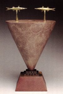 Because of the difficulty of casting and coloring bronze, the work of Pozycinski Studios is hard to imitate. Nonetheless, their designs are copyrighted and registered, and they constantly introduce new designs into their line. Their work, in its plain geometry and in the decorative flourish of the animal imagery, call to mind some of the lacquered metal vases of the French Art Deco designer, Jean Dunand.