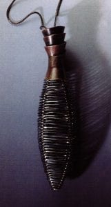 Like many of the jewelers and metalsmiths in this Exhibition in Print, Biba Schutz is self-taught in her craft. About six years ago, she developed a process of wrapping wire over a constructed armature, starting with an anodized aluminum and silver basket (which she admits was awful). Since then Schutz has gradually refined the technique and developed it into a unique production line. She has given up the aluminum, and now works in silver, bronze, copper, and vermeil. These metals have historical associations that aluminum lacks and Schutz says her buyers respond positively to the more pure metal color.