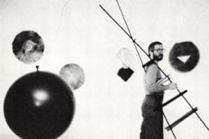 Although Pierre Degen's work can be discussed in terms of fashion's absurd and theatrical nature, I find his work to be rooted more in sculpture. Sculpture, unlike fashion, is an entity which can be contemplated without any other reference point. Unburdened of fashion's dependence on the body, it is free to express a much wider range of ideas. Fashion interprets outside influences, while sculpture can be a vehicle for commentary and evaluation. Degen, we see from photographs, fully intends these works to be carried. The large Ladder pieces are humorous comments on the pretentiousness of some art jewelry because of his absurd reference to wearability. Works like Black Ladder and Balloon, 1983 consist of five foot ladderlike assemblages of primitive construction. Some painted black, others in bright primary colors, these structures support huge three-foot-diameter balloons or red wooden Xs tethered behind. His work has a separate identity which can be contemplated when not worn. That is why they are sculptural. It is for these reasons, lack of wearability and satiric comment, that these pieces fail as jewelry and enter the sculptural domain.