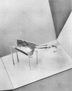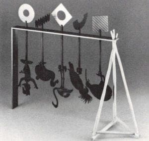 Another important aspect of this work is the combination of materials: steel, nickel, aluminum and niobium with wood, gold plate and found objects. Leupp uses a soft feather or a bundle of sticks with a machined handle in Bird Brush and Indiana State Bird Brush, both from 1982, and in Birds of a Feather, Revised a stick tripod supports one end of the geometric steel structure. In Mere Image, 1983, a stuffed pair of birds perches on a rod opposite their flat metal silhouette. The humor or silliness of the stuffed birds is offset by their elegant shadow facing them, framed in a rectangular window. There is an intriguing quality of softness throughout this work contrasted with rigid structure, of lightness with seriousness, of playfulness with elegance and also of volume with flatness. This creates a vitality which keeps the work from becoming tight and severe or merely humorous.