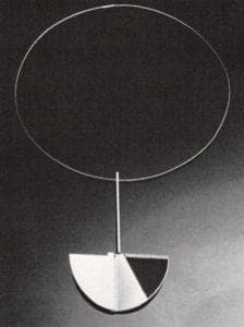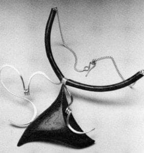 David Watkins's work, unlike Degen's, was clearly as comfortable on the wearer as on the wall. His work is true to jewelry's functional heritage, in terms of its compatibility with the body in scale, comfort and form. Off the body, Watkins's Primary Orbit Neckpiece, 1983, one of many necklaces in the show, is less jewelry than a playful interaction of two-dimensional minimalist elements. Watkins's work, although more readily accessible and easily understood, was clearly among the strongest in the show because it successfully synthesized sculpture and jewelry into a new and exciting mutation.