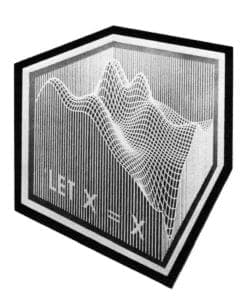 Vernon Reed, Let X = X, pin, photo-anodized titanium, and acrylic, 2 x 2½ x 1″, 1983