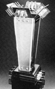 Linda MacNeil, Vase, plate glass and oxidized brass, 15 x 6 x 6″, 1983.