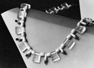 Cage ignores jewelry's traditional wearability and scale. Traditionally jewelry has been used to accent and decorate the body. It can be argued that fashion can also fulfill this function, but I think there are several major differences. The first and most obvious is placement on the body. Jewelry is generally worn in places clothing is not; for example, the ear, neck and hand. The second distinction is one of scale. Jewelry is small in comparison to the body; it is scaled to be compatible to the area on which it is worn. This compatibility is the third distinction, since jewelry works with the body and not off of it. The costume and couture aspects of Cage are certainly fun and inventive, but the practical, functional jewelry aspects seem to be ignored, preventing a real synthesis with haute couture. Manheim's Ladder Neckpiece, 1982, a flexible six foot ladderlike assembly, draped over the shoulders suggesting the skeletal remains of a simple tunic, is less successful. Although its interaction with the body is analogous to fashion, it does not incorporate any of the absurd, playful or theatrical qualities, thus seeming rather uninspired. Many of Julia Manheim's plastic assemblages in this exhibition retain fossilized evidence of their evolution from the necklace format. These dinosaurs failed to fully evolve beyond being large necklaces.