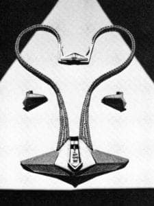 As one tries to put the opposing images together, the natural result is a feeling of conflict: the warmth of God-given life versus the cold of man-made machine. By his own definition, Vernon Reed is an explorer' pioneering the question of humanness in an age of technology. His work is a plausible prophecy of the adornment of our descendents, inhabiting distant colonies in outer space. Vernon Reed's jewelry stands firm as a new class of personal adornment for those whose inner fantasies carry them to far-off worlds.