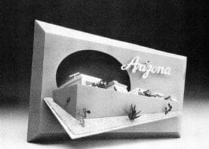In startling contrast to such traditional elegance were the whimsical creations of Peter Jagoda and Dawn Nehls. Typical of Jagoda's diminutive metal fantasies were Doz Tips, a madcap fantasy crafted of bronze, brass and sterling silver in the form of two miniature bulldozers, which appear to be completely functional and designed to "protect" the toes of leather cowboy boots. Also inspired by the jeweler's craft were Dawn Nehls's sculptures, including Arizona. Incorporating copper, sterling silver, nickel, titanium and gravel, this work portrays a miniature billboard with "Arizona" floating in metallic relief above the perspective view of a retirement trailer park.