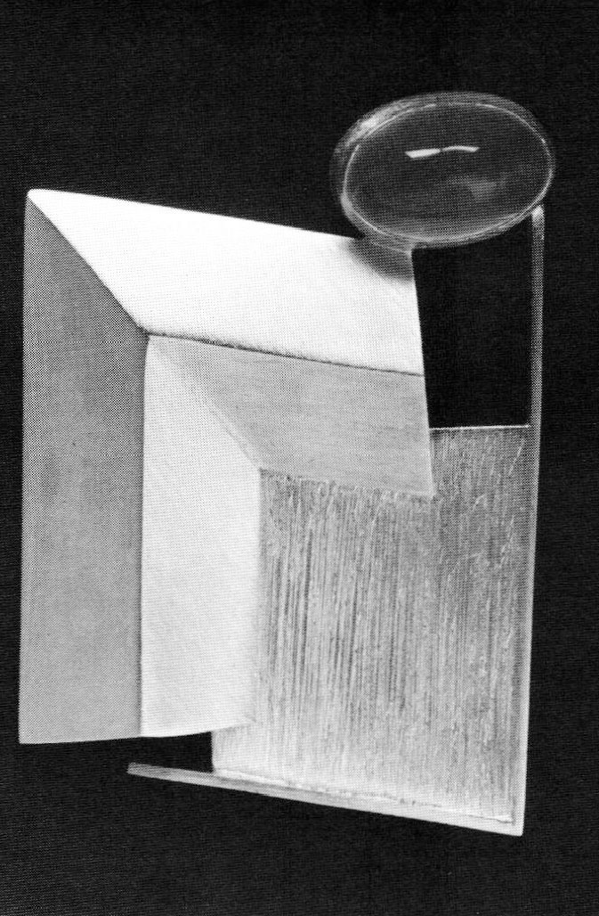 Also outstanding was Randy Long's Vessel for Solid. In this work an inverted cone penetrates the circular opening in a disc. Employing the marriage of metals process, Long meticulously joins sterling and nickel silver to create an illusion of dimensional steps, which in turn are reflected on one side of a pyramid form. Such details with their multiple levels of appeal invited the spectator to view the works intimately.