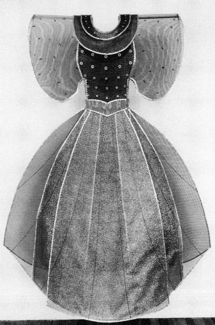 In Three Sisters, Chase uses the basic kimono shape as a point of departure. The arcing, rhythmic curves, accentuated by zig-zag strips of solid aluminum that outline each of the three pieces in the series add vitality to her forms. Randomly scattered on the kimono are numerous "brooches," done in a style reminiscent of the machined look that has become synonymous with RIT, Chase's alma mater. These simplistic brooches consist of a square of screening, sometimes backed by a solid bronze-toned square, ornamented with a single piece of transparent plastic tubing in peach or light green. With these jewelry forms, Chase seems to be good naturedly mimicking the fashion and conceptual art jewelry produced by many of her former classmates. These brooches and the small bronze-colored triangles that also dot the garment, combine to push the piece toward the realm of pattern and decoration. However, attempting to place her work within this category, or within the category of representation and narrative (because these bodiless garments seem to have a story to tell), does disservice to the originality of Chase's artistic conception.