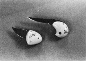 Peter Jagoda's recent works demonstrate his skill as a knifemaker. His graceful 4″ Thumblade and whimsical 3″ Thumblade were made of 01 steel and brass with handles of white micarta in which he has inlaid tiny shapes, dots and dashes of colored epoxy. Jagoda's knife forms were sensitively shaped and often detailed with grooved file work as an individual accent. Good examples were his handsome Drop Point Skinners with black micarta inlaid epoxy handles. Jagoda's knives are works of art that succeed functionally as well.