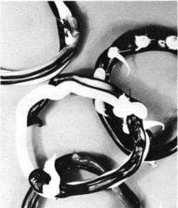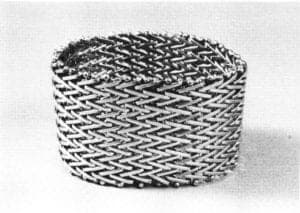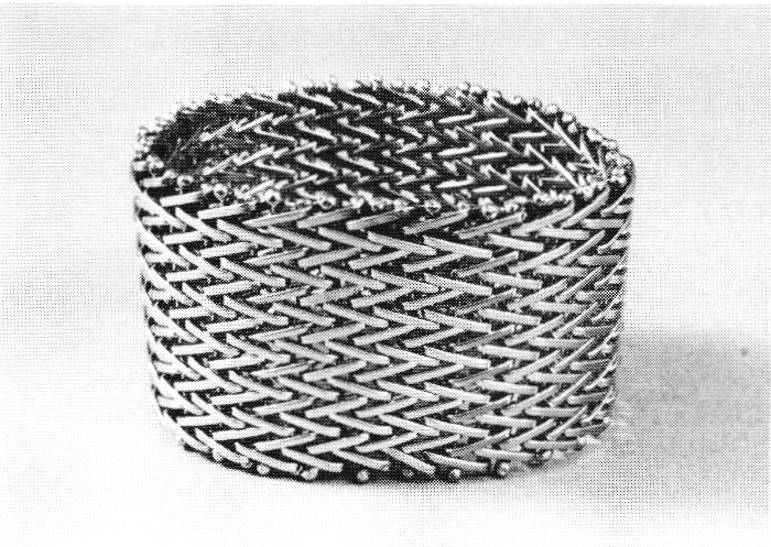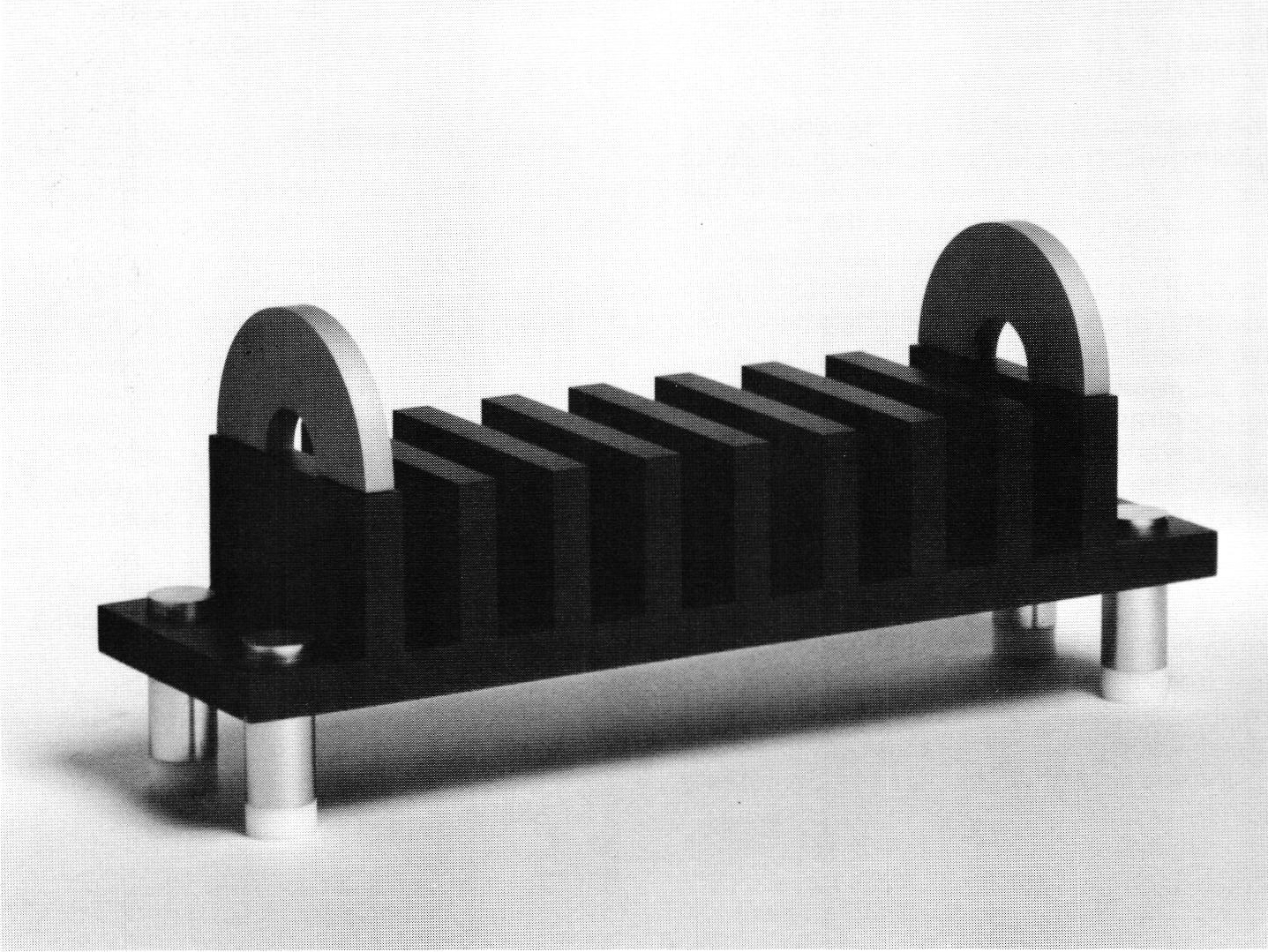 The elegant work of Hans Appenzeller of Holland, shown in an overview of the years 1973-1984 in 28 pieces, contributed his international approach to jewelry design. Appenzeller's designs reveal the Dutch desire that jewelry emphasize concept. Appenzeller works in series or collections, each investigating a particular theme, problem or special material. Two bracelets from the 1973 collection featured aluminum tubing and rubber straps to make the closing at the wrist or to act as a hinge to join the two part band. Four bracelets from 1981 combined marblelike synthetic discs of corian inlaid with black pvc strands, some of which extended like black tentacles that bounce and bend when worn. A large, handsome cuff of women stainless steel exemplified Appenzeller's interest in textiles and principals of industrial design and engineering. More organic in character were the 1984 structured cuffs and woven matt earrings, cast in precious metals from filed woven strands of wax. These recent works continue Appenzeller's design sensitivity in creating elegant jewelry, dramatic when worn.
