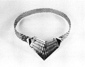 In noticeable contrast to her brooches and earrings were the three major neckpieces in the show. The first two Antique Red Beads and Black Onyx Beads employed pillow forms in fused silver and gold as central elements in a multistrand bead necklace. The follow-formed pillows appeared rather heavy and did not relate well to the beads. One felt they were contrived in an effort to participate in the current popularity of beaded necklaces. In marked contrast, the third neckpiece Black Shell Beads was unique for its elegance and simplicity. Composed of a single strand of black shell beads with a central pendant of hollow-formed, heat-treated brass and two simple pieces of forged silver it had a refined but primitive appearance. Strong and direct, one could envision it on the neck of an African priestess. According to Lippe, this necklace was inspired by her interest in African and Oriental art and is a blend of the two esthetics.