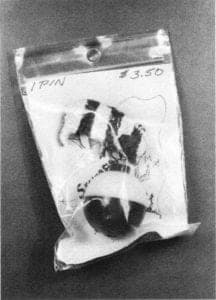 Each piece must be mounted on a square of cardboard, or in a plastic bag, because all the work is presented on large pegboard panels. As a result, many students make a coordinated presentation of the jewelry and its packaging. Others use the opportunity to make exotic juxtapositions: a fashion design major made earrings of inner-tube rubber packaged in clear plastic disposable gloves; another student placed colored-Xerox pins in ziplok plastic bags.