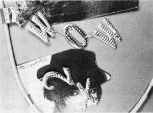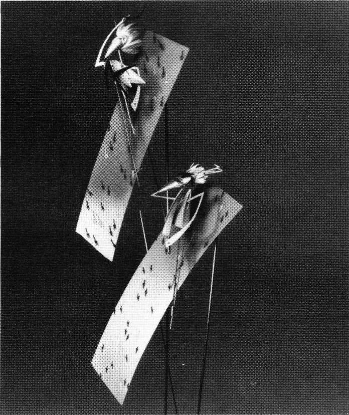 A contrasting approach was projected in the metalwork by Christine Smith. Not concerned with wearability, she uses the brooch format to create impeccably crafted, colorful and often humorous comments on her experiences and places she has lived. An especially cold winter produced Frostbites, a miniature window with shade set against a fragmented wall of silver pierced with tear-drop-shaped patterns. Outside this tiny environment were three colorful "frostbites" of turquoise, coral and purple acrylic. Mounted on tiny stands, they had rectangular heads with eyes and open mouths full of sharp teeth.