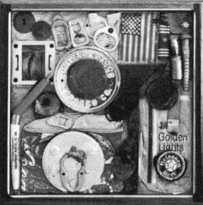 Boy Scout Gets Old is another Woell piece on this same subject. It is a wooden music box with a cast boy scout standing at attention on top of what appears to be a two-tiered wedding cake. The boy scout holds the mask of an old man in front of his lace. As the music box plays, a small sports car turns inexorably around and around.