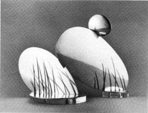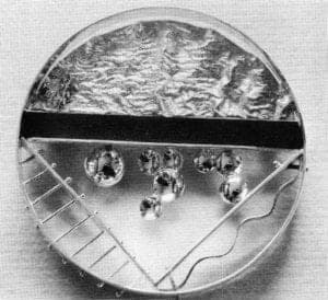 Inventiveness was shown to a high degree by many of the designers of the pieces on exhibition, and although the pieces were not always high level, virtuosity was fairly frequently noticeable in the exceptions. Students of three or four years are only beginners after all, and these skills have taken the men who utilize them a lifetime in the trade to acquire. In England the traditional high level of skills involved in both the silversmithing and jewelry industries has been severely depleted by the disappearance of many well-known firms.