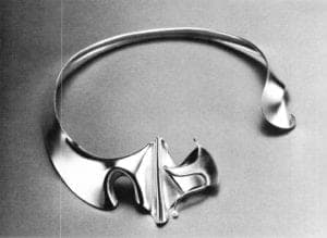 Some other examples of the many beautiful pieces on display were: Judy Frosh's pendant Kyoto's Forbidden Gate—subtle mystery and beautiful use of several oriental techniques. Yvonne Arritt's collar Space Wing N—very strong and clean in design. Although the piece was bold in shape and size, it suited the human body very well. Wilma Lehman's pin Puffin—flowing lines reminiscent of Art Nouveau. The same Art Nouveau inspiration was found in Betty Helen Longhi's Necklace/Sculpture, where the two separate parts seen together formed a sculpture in one flowing line. When the necklace is removed, the remaining form holds its own.