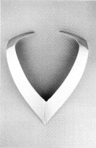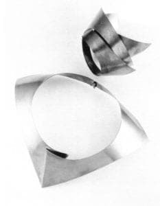 The same care, consideration and craftsmanship is to be seen on all surfaces of the pieces. She gives special attention to detail, such as how the pieces are terminated. Contrast in her pieces derives not from patina but from a subtle variation of white texture given the silver through scratchbrushing and hand polishing. Douglas's work displays a sensitivity to angles, curves and proportion, as well as; an awareness of how the pieces will be worn on the body. For this show, the culmination of her MFA degree from Arizona State University, she executed both wearable pieces and functional objects, including neckpieces and collars, bracelets, ear ornaments, rings and a pair of candlesticks. Although she involved herself with many techniques during her last five years at A.S.U., here she chose to focus on folding thin-gauge sterling silver to create a volume of form.
