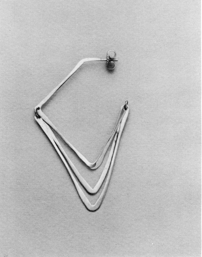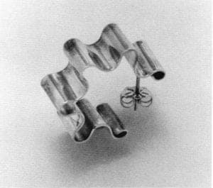 The work done in the years 1970-75 heralds a new direction. By using sheets of silver that were essentially folded, scored and cut, Moore begins to explore mass instead of line. Her earrings now gracefully sculpt and include the lobe, instead of using it as a display point. The forms seem to be inspired by nature, yet still have the curvaceous Moore esthetic. She notes that at this time she began to synthesize the lessons learned previously from the fabrication of her first efforts, with the on-going inspiration fine sculpture provides.