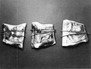 A small brooch entitled Picture Frame was notable for combining the best of Lippe's earlier style with the freedom and color of her new work. A scene of sterling silver trees on a background of heat-colored bronze gave the impression of infinite distance. This was enclosed by a frame of fused silver slashed at the bottom and "buttoned" together with tiny gold squares. The constrast of the expanding imagery of the picture and the containment of the frame held by these two points of gold gave a wonderful feeling of tension and excitement.