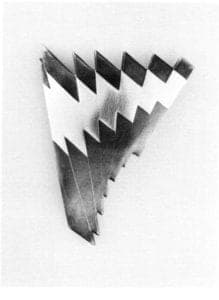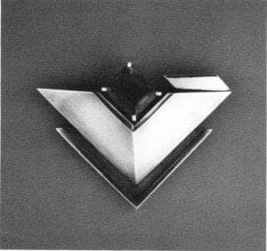 Havener's pieces here had a menacing quality, due primarily to two factors: their angular and sharply pointed forms, many of which were reminiscent of arms and armor, mostly knives, swords and helmets, and their dark coloration, consisting of varying shades of brown and black. Their aggressive appearance was reinforced by the artist's choice of titles: Guarding, Crusade, Entrap. Guarding was reminiscent of armor in general and of a Spanish conquistador's helmet in particular.
