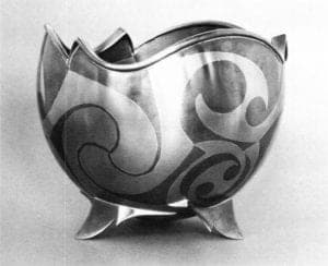 Humor was also evident in Window Grille by Jay Burnham-Kidwell. Made of forged steel and titanium, this 5′ by 2′ construction included images of a palm tree and flamingos. Kidwell is skillful in his forging, chiseling and joining. Characterized by classic simplicity was Kidwell's Sardines Bowl, a 12″ vessel of raised mild steel with a tiny chased sardine near the edge.