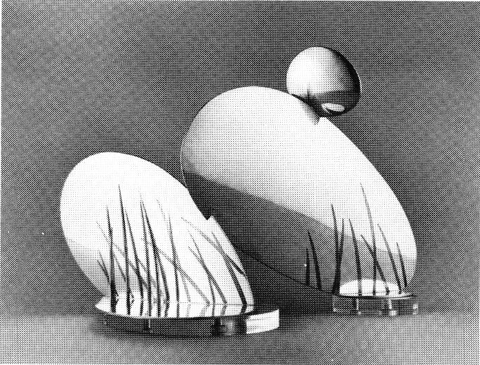 The metal sculptures of Jon Havener, a metalsmithing professor at the University of Kansas at Lawrence, were exhibited at the Gallery Karl Oskar along with the photographs of Rick Dingus and Fred Parker. Havener's sculptures had a dramatic and powerful presence that overshadowed the two-dimensional work of his coexhibitors. His sculptures are a study in complexity and contrasts.