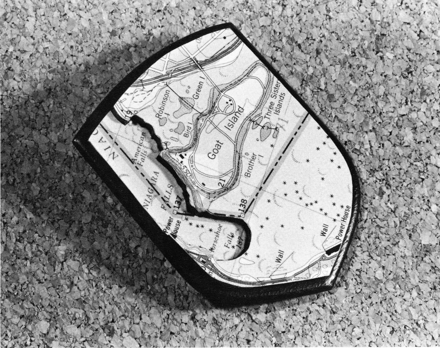 In Topographical Map Badge the artist plays on the duality between the cartoonlike imagery of the map and the physical reality it signifies. The two-dimensional graphics are bisected and made three dimensional and reference is made to inherent structural qualities.