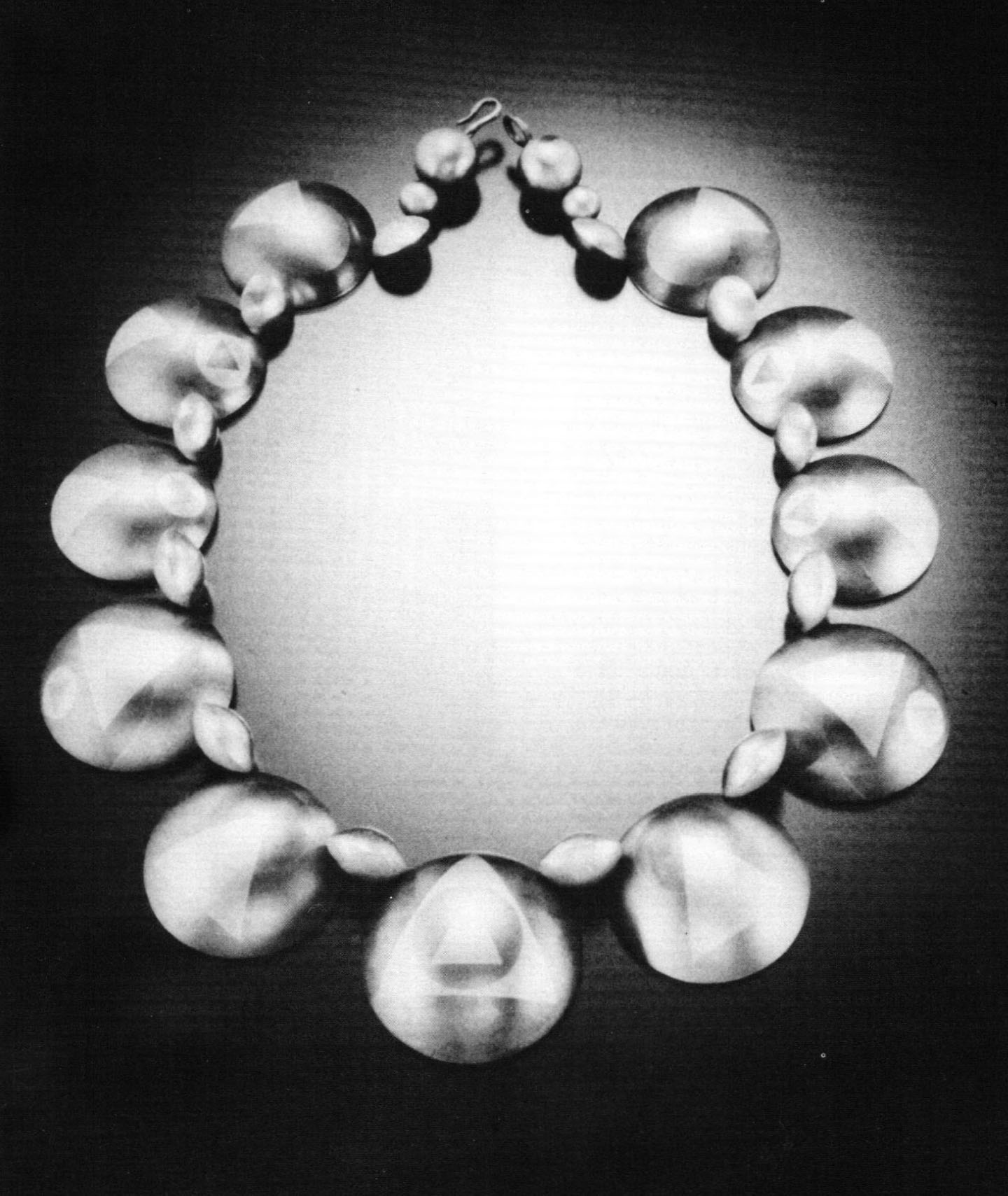 The remaining works are bracelets or necklaces of hollow fabricated silver shapes, combined with tubing and ivory or hematite beads. They have the primitive quality of most bead compositions, but the etched tubular connecting pieces and the occasional angular bead jerk your perceptions back to the present. Each necklace, such as Melon Bowl, is composed of a large central form, which holds a number of smaller shapes that are repeated at intervals through the length. There is a whimsical quality to these pieces arising from the contrast of familiar shapes and unlikely surface textures.