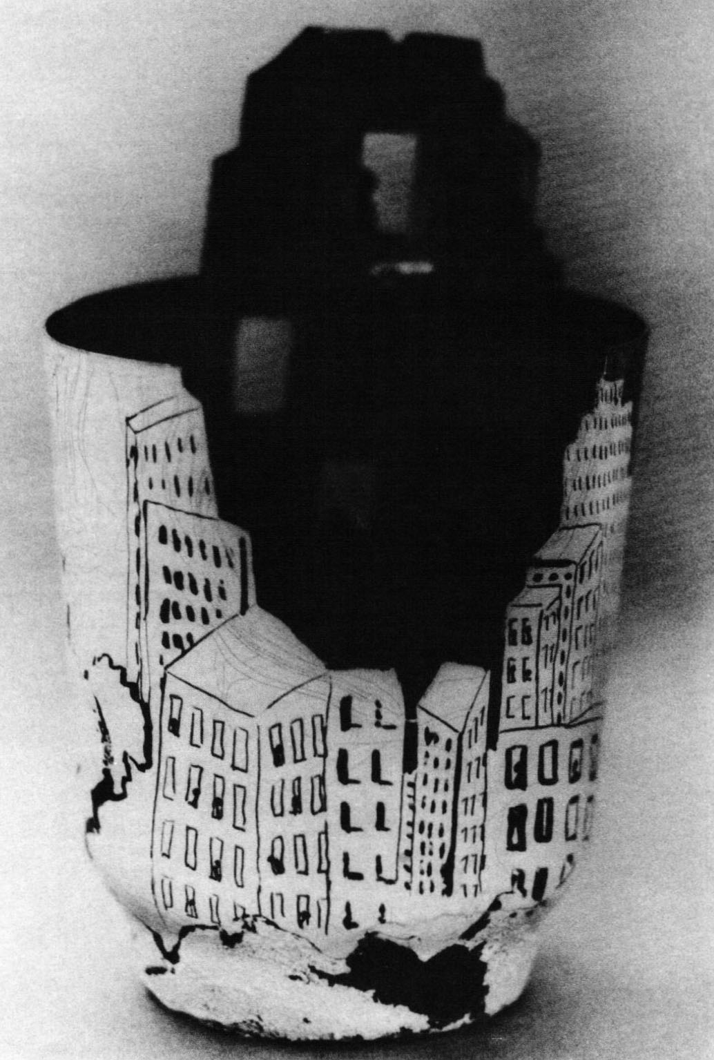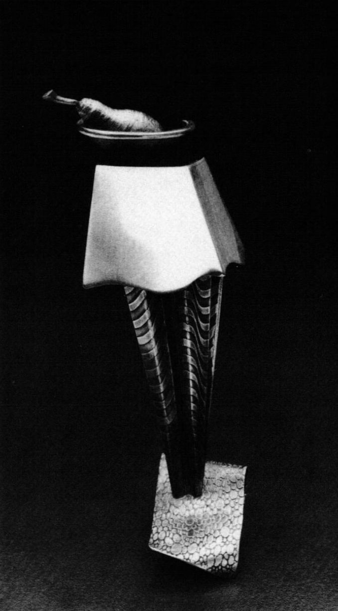 Although technical mastery in enamel was exemplified in several works by Miami Professor Emeritus Helen Worrall and Mary Ellen McDermott of the Cleveland Art Institute, Cincinnatian Mary Klein used precise control to enhance the relationship of enamel to drawing and painting. In a beach scene, called Arc with Decorative Accessories, she fused the rich tonal subtleties of champlevé and the descriptive potential of cloisonné while preserving a traditional sense of ornamental surface. The series Brownstone Landscapes in vitreous enamel by Vivian Bass Kline of Cincinnati, on the other hand, used cuts and attached pieces to convert standard spun vases into miniature urban stagesets that were not always technically successful and sometimes vacuous.