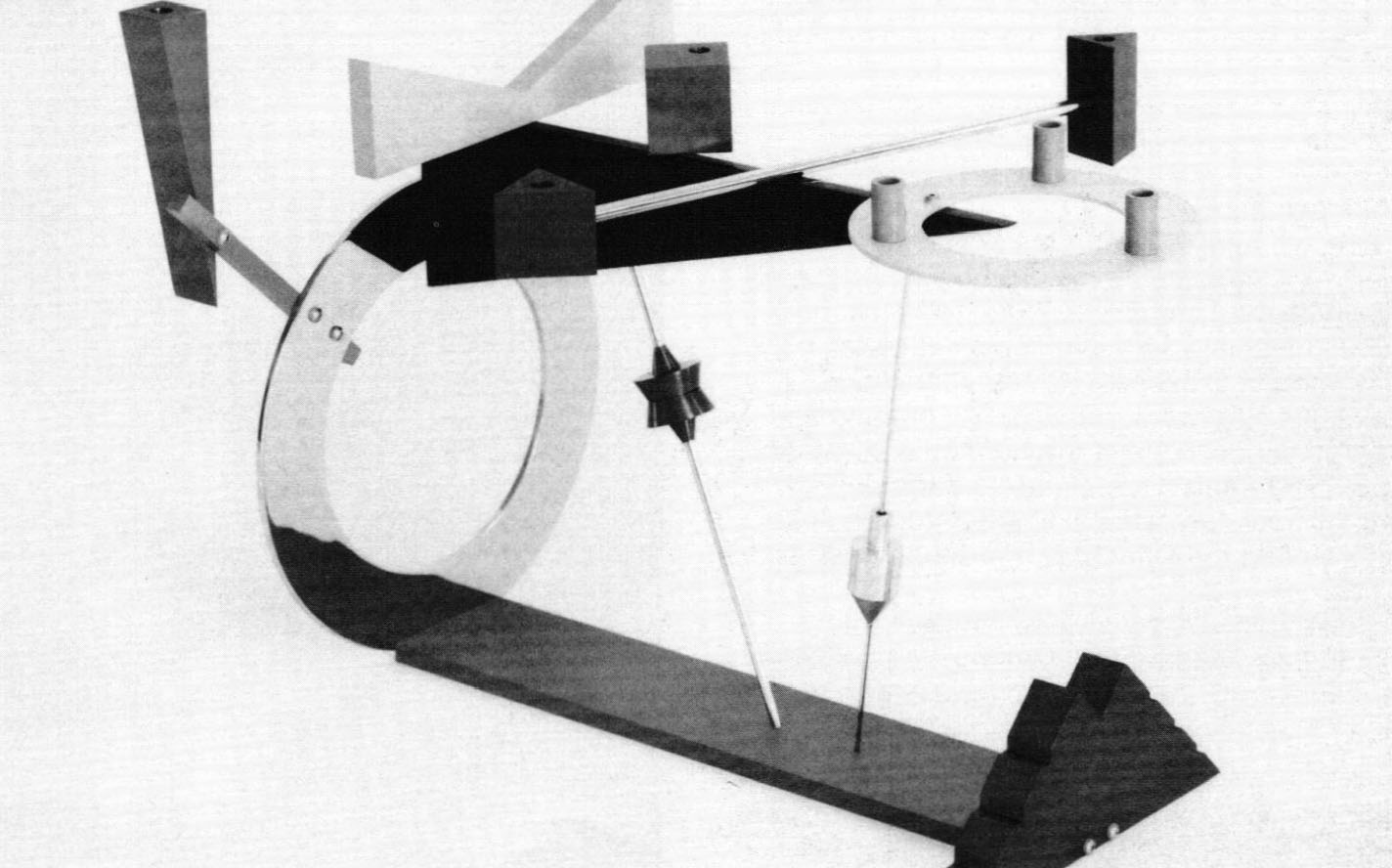 Skyhook #2 encourages amused responses. The glass, held in place by the tension of construction, would shatter the moment the machine actually began to produce. The artist points out that, like this piece, the quality of life in society is shattered when the machinery is in production.