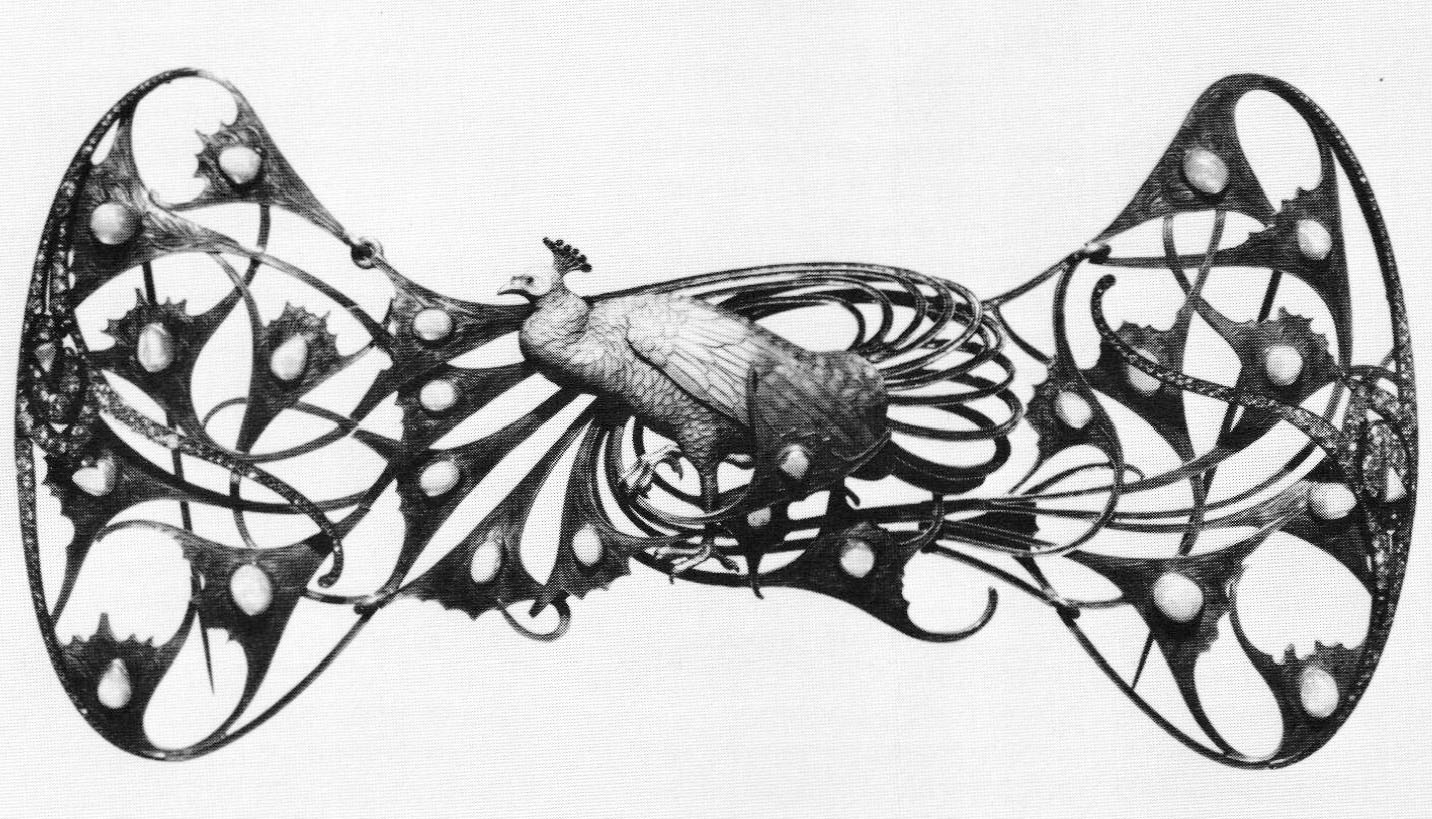 Becker, like Eidelberg, created a context in which to view Lalique's work. Her first slide showed his 1900 display window at the Paris Exposition Universelle. She successfully evoked the shock the public experienced on being confronted with his work; nude women, bats, exotic, erotic, morbid imagery. Using comparisions, she demonstrated the vital, intense aspect to his work, which set him apart from other jewelers of the time. Turn-of-the-century ideas and concerns were introduced. These included a preoccupation with transformation, metamorphosis, the change to a new century, changes in society and in societal roles. Lalique's metaphors for this included butterflies, fish, water and frogs. The rise to fame of women like Sarah Bernhardt and Loie Fuller and the sensual, self-willed image they projected were part of the changing perceptions of the role of women at the time. Both women knew Lalique, and Bernhardt introduced him to Gulbenkian.