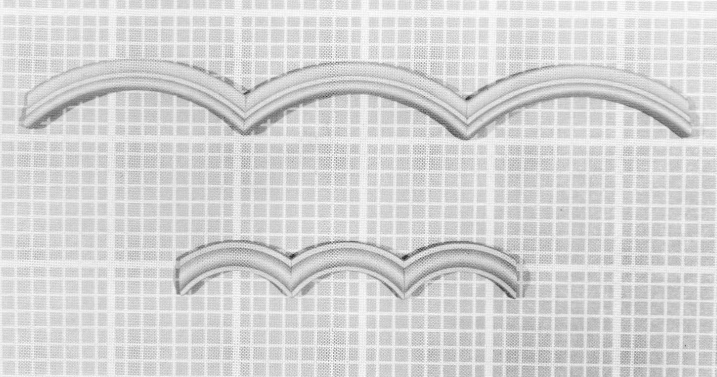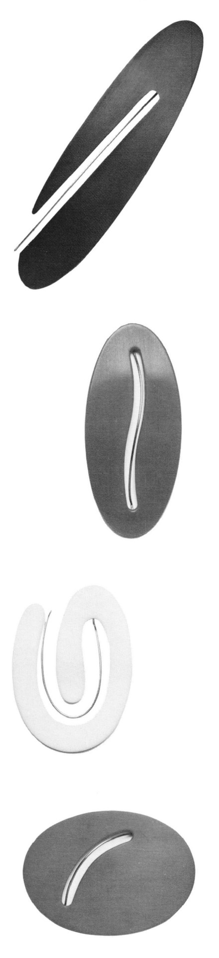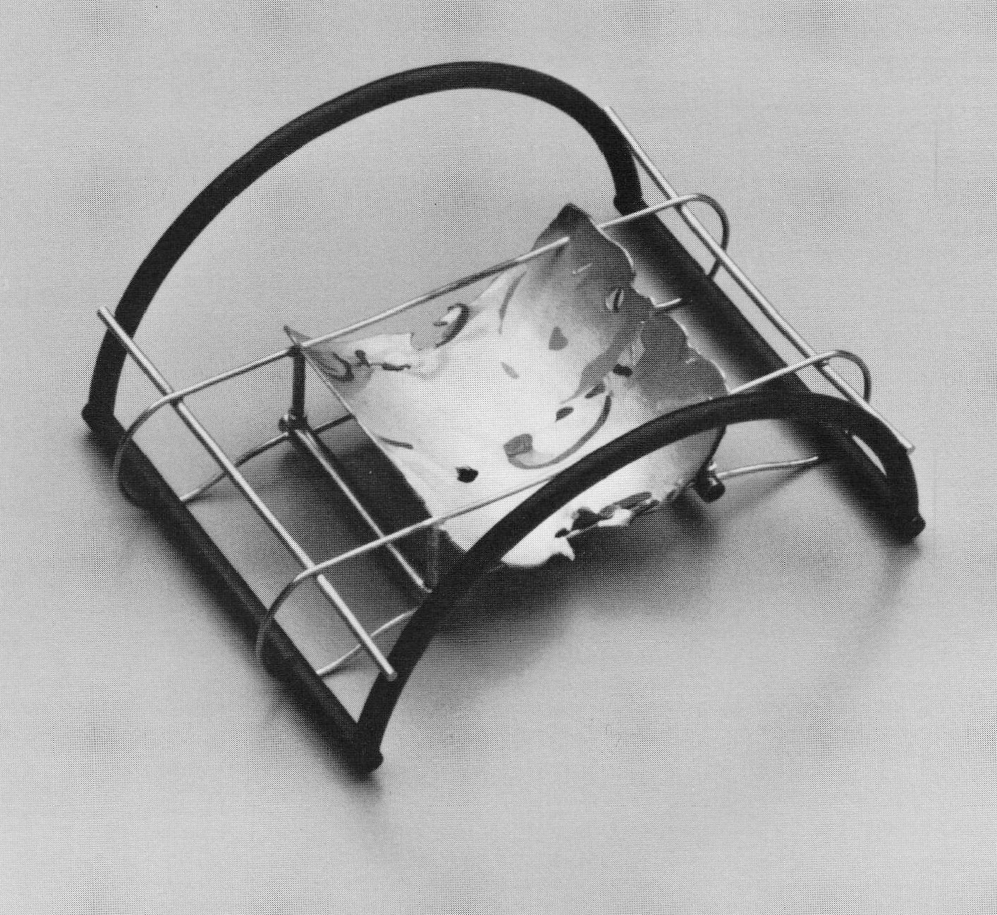Convex and concave polarity occurs in this work in groups of pieces that include pure wire forms, metal plates with wire and plastic forms, over which elastic bands hold the forms to fabric from the back. The apparent simplicity of the shapes is quite misleading. There is a great sophistication in engineering that reduces a mechanism to its simplest form and still works. The challenge is to produce maximum results with the purest of elements. That is the mark of an experienced and talented designer.