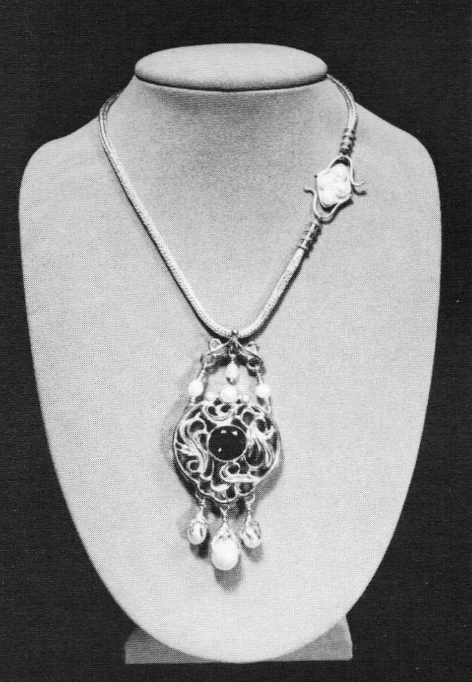 Work by other instructors was on display, including Ronald Wyancko's graceful sterling silver forms, which added a sculptural dimension; Mary Kretsinger's exotically constructed and enameled jewelry in high karat golds and sterling. Her necklace of 18k yellow gold and lade is particularly noteworthy. The setting for the antique lade can be taken apart and worn as a separate pin. Her expressively enameled and granulated neckband also shows her great ability to design and construct complex jewelry.
