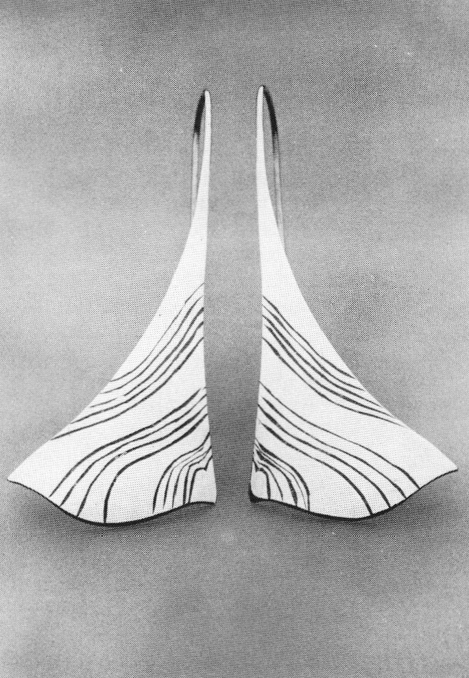 Tina Chisena takes several techniques that lend themselves to linear surface decoration and incorporates them into sensitive sculptural form. Her sterling silver and niello earrings had an elegant flowing shape, enhanced by the curving niello lines that both emphasize and counterpoint the movement of the total form. Although seen in a case, these pieces come alive when worn because Chisena has subtly involved the function as an important design element. Her work is characterized by its small scale, intricate design and careful craftsmanship. Whether using cloisonné, mokume-gane, niello or other media, she explores the lively graphic potential of each.