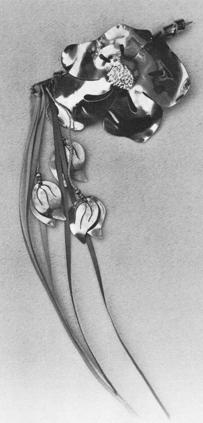 Flowers provide a central motif for Joan Levy's work. Not delicate, fragile little blossoms but expansive, exuberant and full-blown hothouse blooms. Large in scale, active in texture, form and color, some of the pieces are so involved and agitated that the viewer is overwhelmed and visually exhausted. The best pieces are consistently lively and decorative in a personal way. Her "Paisley" belt buckles and shawl-sweater pins are notable in successfully incorporating the function into the form. A "Poppy" necklace successfully combined a simple nickel shape with gray silk ribbons and small, pierced and formed petals sprinkled among the ribbons.