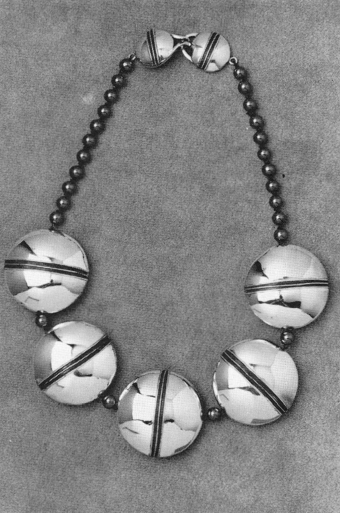 In one of the latest groups of work is a necklace based on sections of squares and circles. Heavy chromed brass tubes of circle segments are alternately strung on elastic cord with chromed half-squares. The metal sections can be positioned in different attitudes both on the wearer and as standing metal sculpture.