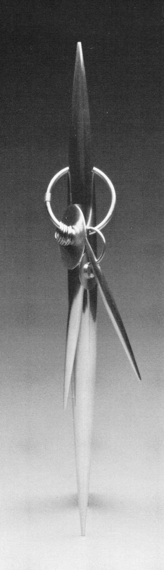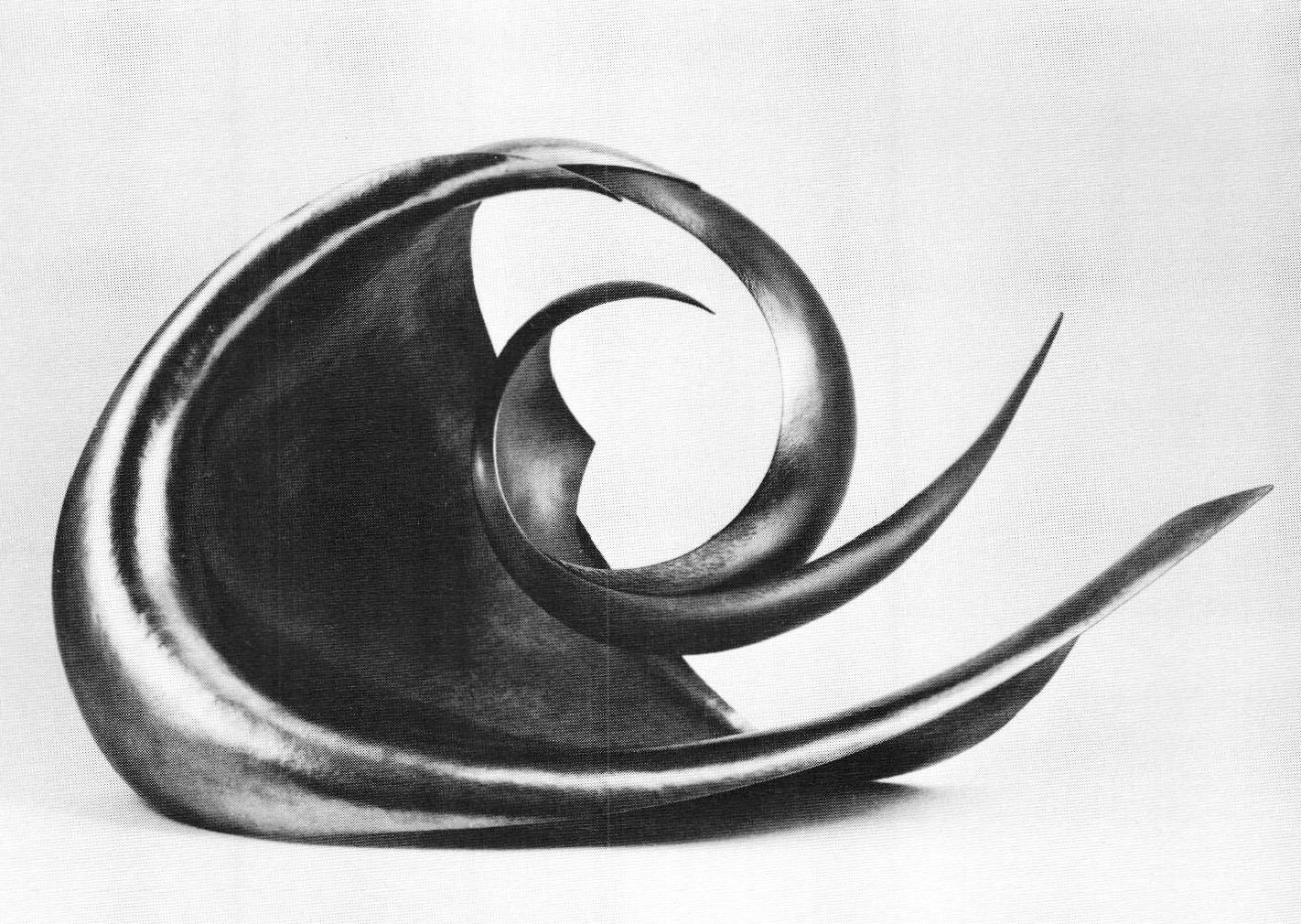 Breaker, composed of nickel silver and niobium, is spectacular in its conception and execution. The blue-green niobium wave rushes through its own reflection on the nickel silver—a marvel of grace in the echoing curves. Longhi illustrates skillful control of a resistant reactive metal. Breaker has a critical balance point, which permits it to rock gently for five or ten minutes. Ingeniously assembled, with no mechanical parts showing, it creates the illusion of a fluid, free-floating object. Longhi successfully coaxes a seemingly spontaneous breaker of niobium to float in harmony above its silver sea.