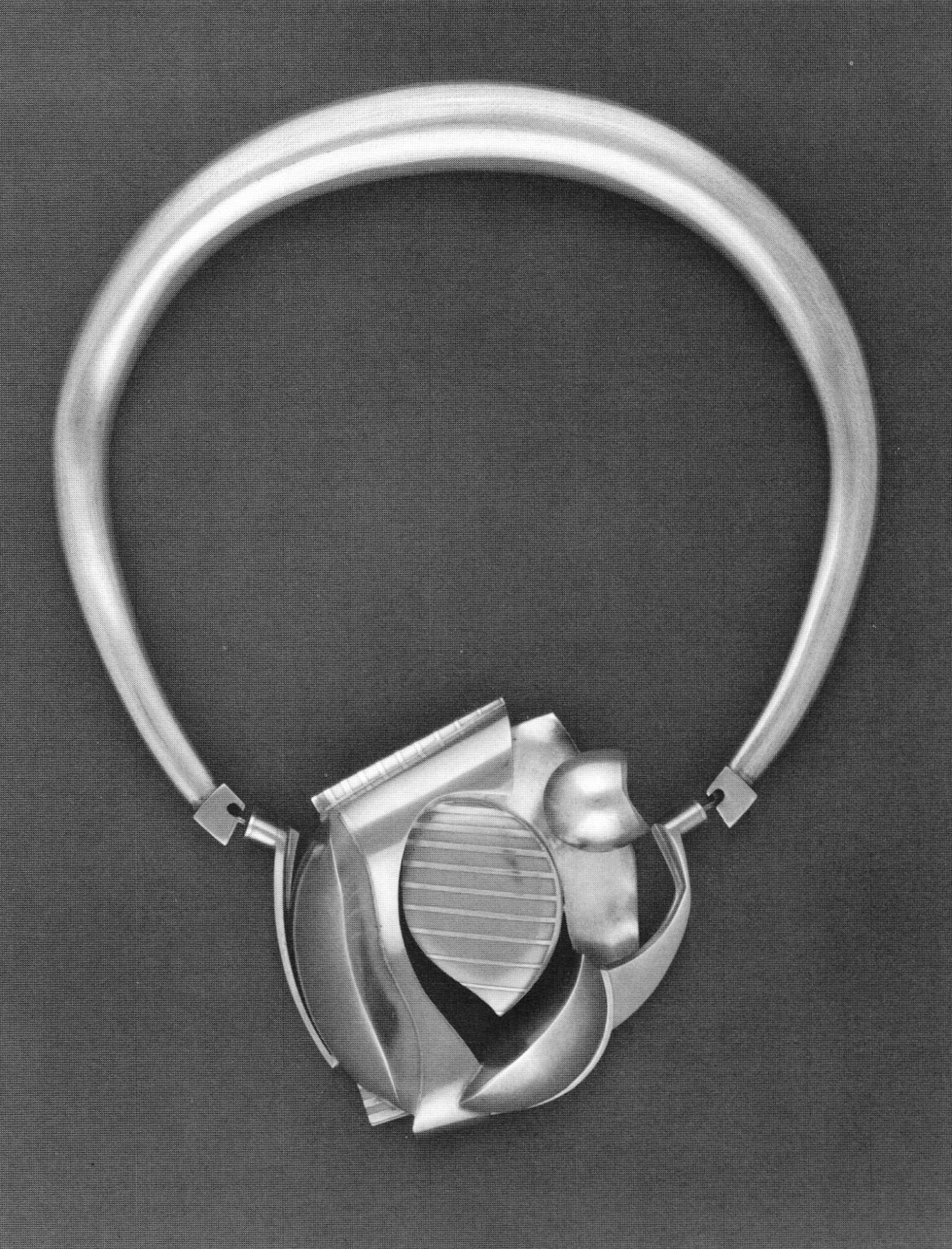 Other series of neckpieces, bracelets, brooches and rings, all based on sections and planes of a circle, are elegant forms when seen as groups. It is then that the relationships of the variations are most evident. Primary colors accent the curved strips adding a playful and humorous quality.