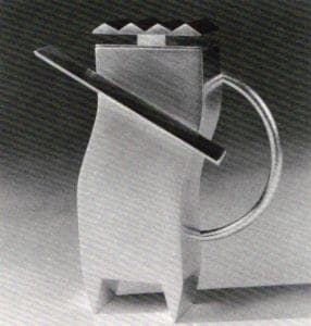 Also successful at playing with tradition were Nancy Slagle's Single Serving Teapot, 1986, of sterling silver and Christina Baitz Brandewie's Tea for Two, 1986, of pewter and ivory. Slagle's teapot is a slim, rectangular box with a subtle serpentine curve that suggests a stylized human form. It looks, in fact, incredibly like a woman poised in the midst of a dance—the tango, perhaps—and the spout of the teapot, like the outstretched arm that leads the dancer forward, just into space. The handle is a simple arc that looks as if it were tracing an arm from the shoulder down to a hand on the hip.