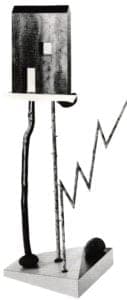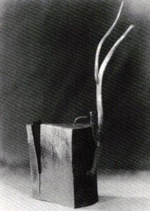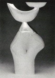 Artists are always working with and breaking from traditions, and during transitional periods this tendency may be especially marked. To underline that traditional holloware hasn't completely disappeared, the show includes Ron Brady's Apple Blossom Bowl, a piece made with classical silversmithing repoussé and chasing techniques. It was dated 1986 but could have been made two centuries ago. The other end of the spectrum was represented by Susan Hamlet's Vessel Study #2, also of 1986. Austere and intellectual, Vessel #2 is a linear diagram of the outline of a vase, a Constructivist-inspired martini glasslike shape with a swizzle stick leaning against the rim.