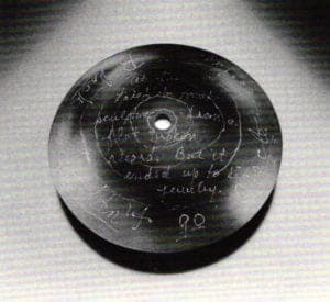 Perhaps the most enigmatic group of works are recent ones that have written inscriptions roughly scratched into their surfaces. These appear 10 outline the artist's thoughts concerning their inception and evolution. One example reads, "Black shouldn't go circle wise. I tried to make sculpture from a flat broken record but it ended up to be jewelry" An apparent concern seems to be how to treat an object's surface in a meaningful way while eschewing decorative two-dimensional effects. This particular piece also has a recessed center containing inlaid gold. The combinations are starkly contrasted and quite sophisticated in execution.