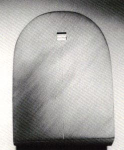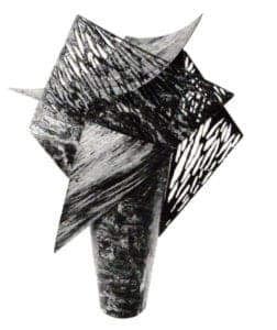 All the work produced for this show is fabricated from black acrylic sheet, 1/16″ in thickness, bent, glued and worked to a satin smooth finish. The craftsmanship is such that the seams joining the various hollow sections of each piece are barely perceptible. On first sight, the individual works appear to be either solid castings or carved from material such as ebony. It is a surprise to handle one of them to discover the actual lightness that belies the density and visual weight of its material. Formally, the works consist of fairly regular geometric solids such as discs, cylinders, triangles, cubic and rectangular shapes that in some cases are notched, divided or cleaved with fins and protrusions. Because of their proportional relationship, and the uniform finish that displays no handwork, these objects have an industrial, even mechanical look that gives them a somewhat impersonal, yet cool, elegant quality.