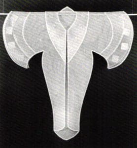 One does not expect this reverence for and celebration of life in an exhibit dominated by clothing made from stiff, transparent, anodized-aluminum screen. Yet there is grace and joy in every piece Chase has chosen to use anodized screening because it allows her "to explore clothing as barrier, protector, and container, is transparency allows [her] to experiment with the way space is defined.