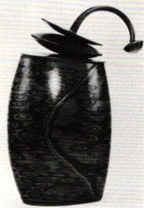 The containers recall the pure forms for which the artist is better known, and they provide an eloquent counterpoint to the more spontaneous pins. They are visually strong, emotionally powerful. Although the container is a more controlled form, an unexpected element appears as a playful appendage emerging from the top of one voluptuous form. The work quietly engages the viewer, inviting one to contemplate more closely the stripes in an overlapping ruffle against the traditional wood-grain, mokume-gane pattern surrounding it.