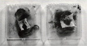 The grid in these pieces is representative of Western culture, predicated upon control and prediction of natural statistics. The gauze is a parody of the grid. Manipulated within the culture boxes, it symbolizes our self-manipulation within the culture. This is not finger pointing, since Lewton-Brain includes himself in this vision—his hair, his blood. He is playing with context and meaning, cultural acceptance of commercialized violence is accepted culture. And the culture that we, like Icarus, tend to cultivate becomes the propaganda of consumerism. lf it can be sold, it can be justified. The joke is on us. It is a participatory piece, with artist as producer, viewer as consumer.