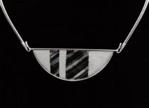 In the Kuhn's newest work, geometric shapes are truncated. The implied sections are realized by Roger's metal lines or Belle's planar enamel. Thus negative space expands the design field to fabric color and texture as the brooch or necklace is worn. This also makes for lighter wearability for larger brooches a serious consideration in enamels.